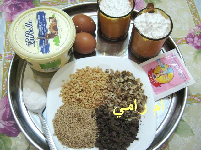 250 غ مرغرين + 2 بيض +كاس سكر قلاسي + كاس نشاء +كاس تاي من الجوز واخر من الكوكاو واخر من الجلجلانية واخر من شكولا مقطعة +فاني +خمير ة +فرينة